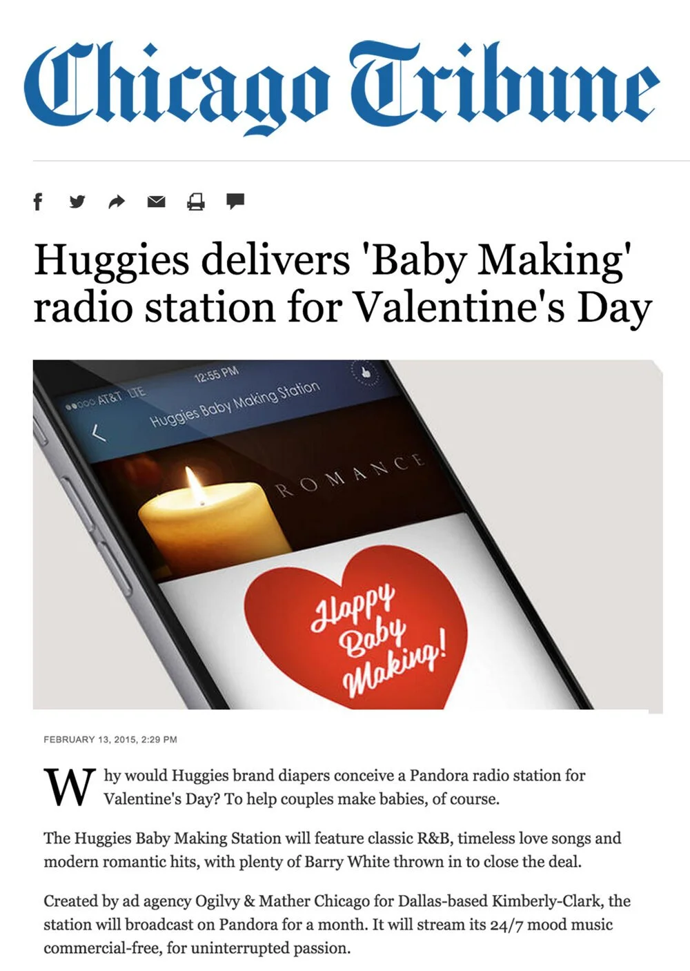 The birth rate had been plummeting for six consecutive years—a terrifying trend for anyone in the diaper business. So, we took action. We created a dedicated Pandora station loaded with "love-making hits" and made it ad-free to ensure couples could get in the mood and stay in the mood.